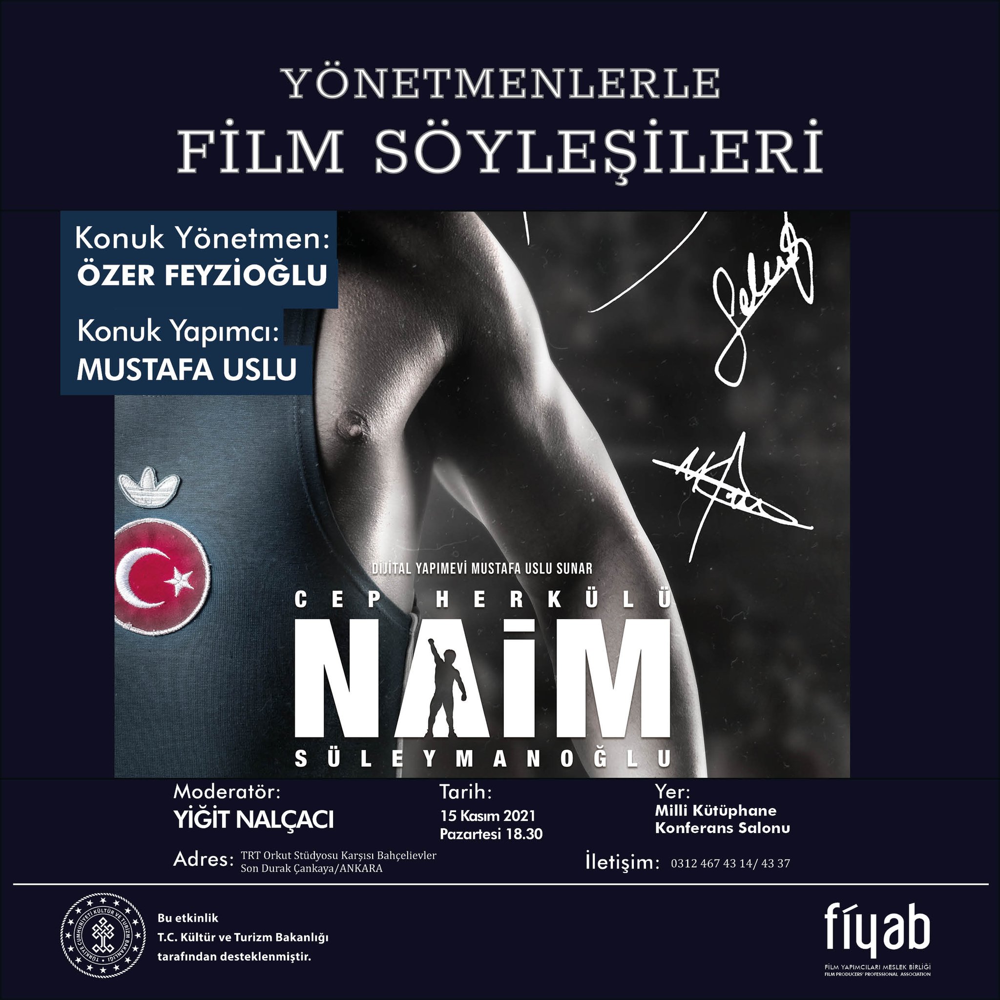 T.C. Kültür ve Turizm Bakanlığı tarafından desteklenen Yönetmenlerle Film Söyleşilerinin 15 Kasım Pazartesi konukları Ayla, Müslüm, Türk İşi Dondurma, Çiçero, Cep Herkülü Naim Süleymanoğlu filmlerinin yapımcısı Mustafa USLU ve Cep Herkülü Naim Süleymanoğlu filminin yönetmeni Özer FEYZİOĞLU